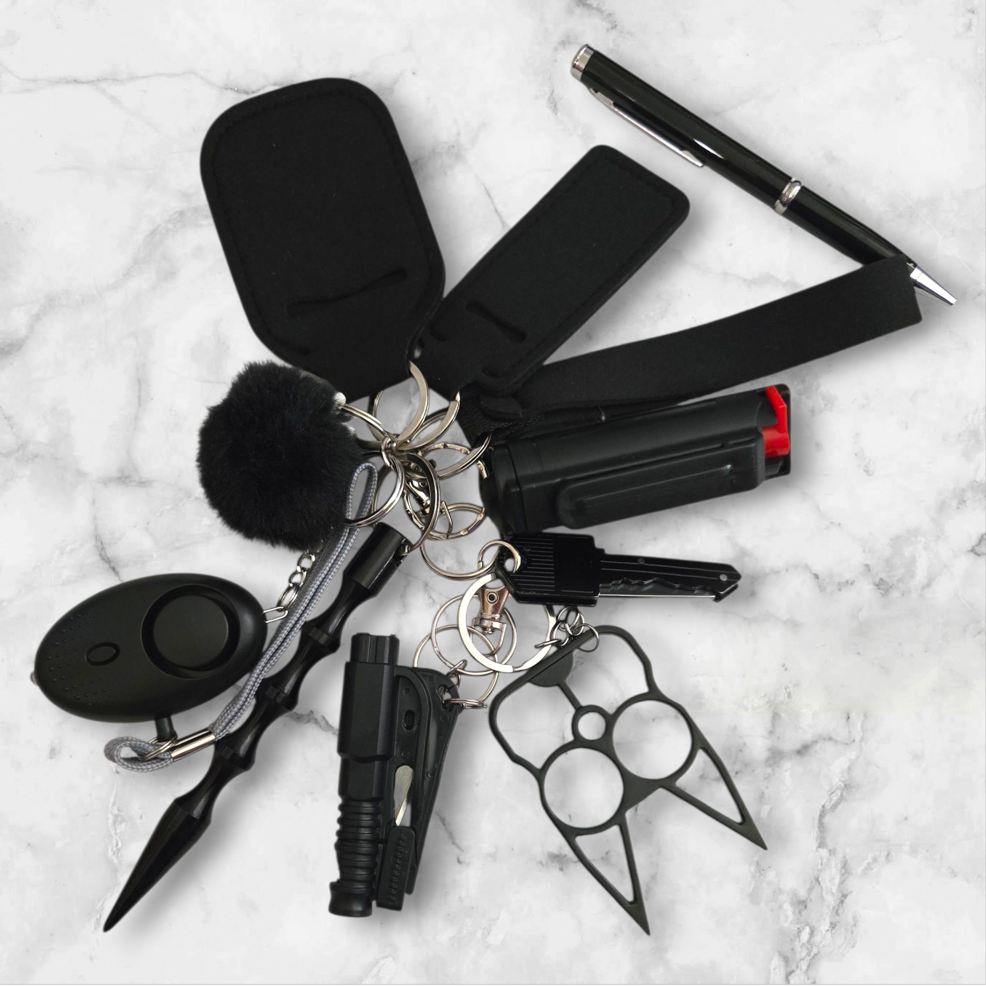 4pc set of wristlet, lip stick holder. Hand sanitizer holder with bottle, kubaton, pom pom, security Alarm, and pepper spray, Pen Knife, Key Knife, Window Breaker, Kitty Knuckles