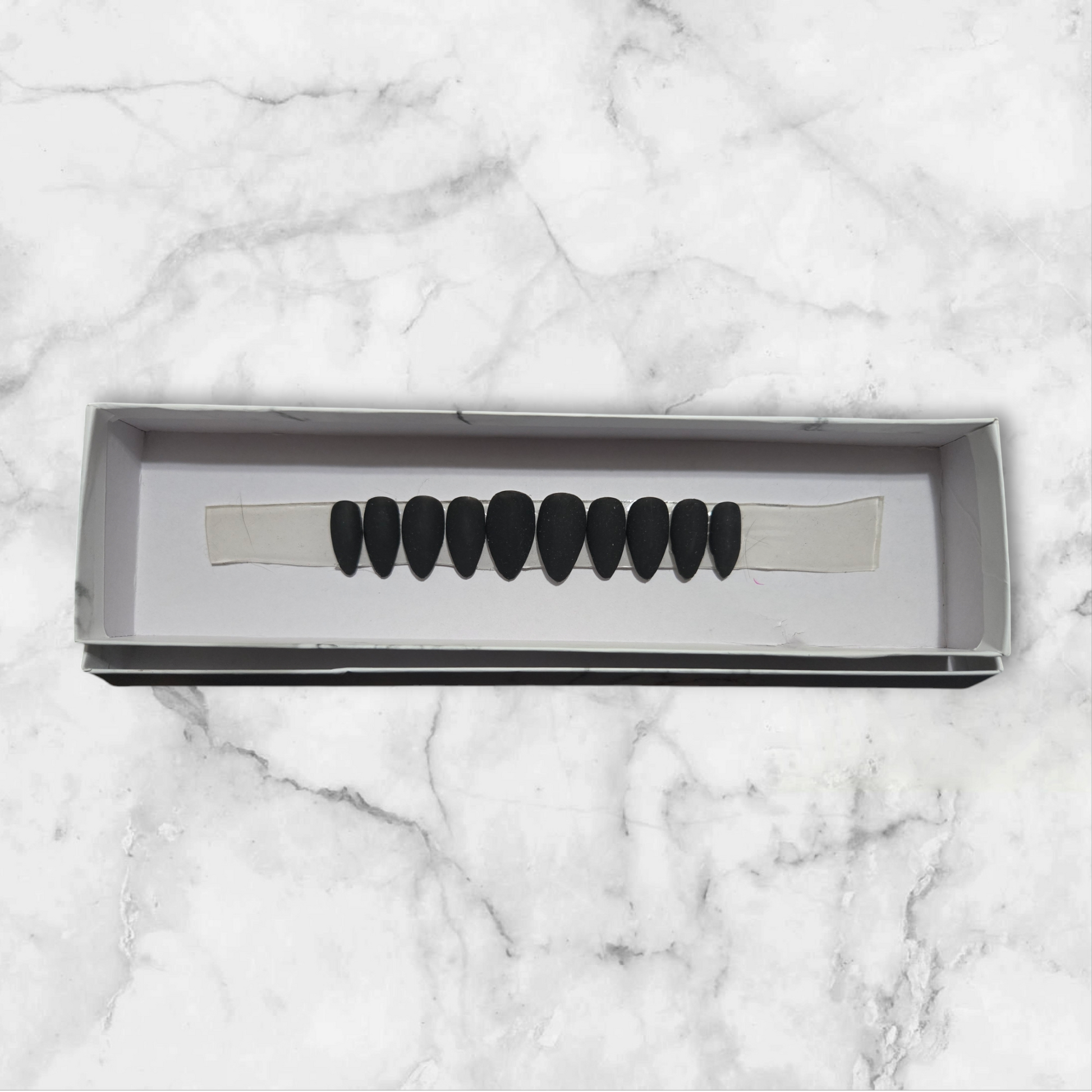 Short Stiletto Nails, Black color on each nail with a Matte Top coat