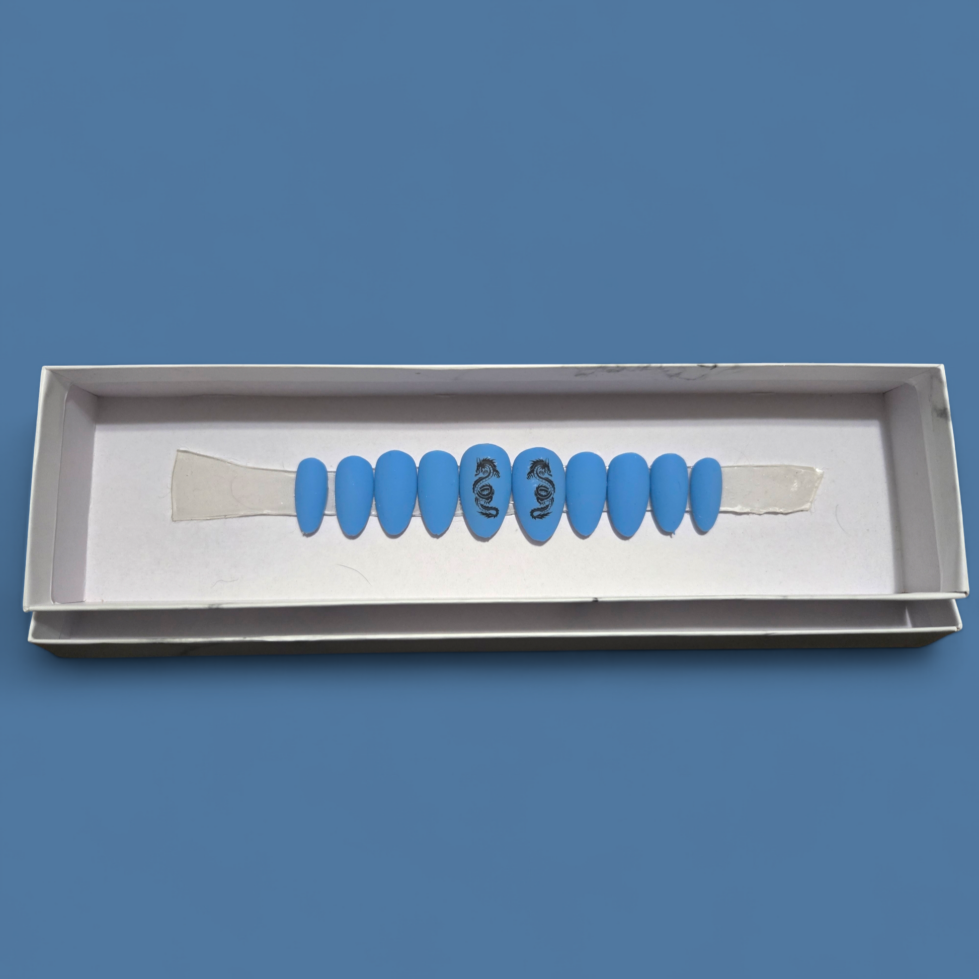 Short Almond Nails, Light blue color with a matte top coat and a black dragon on the thumb