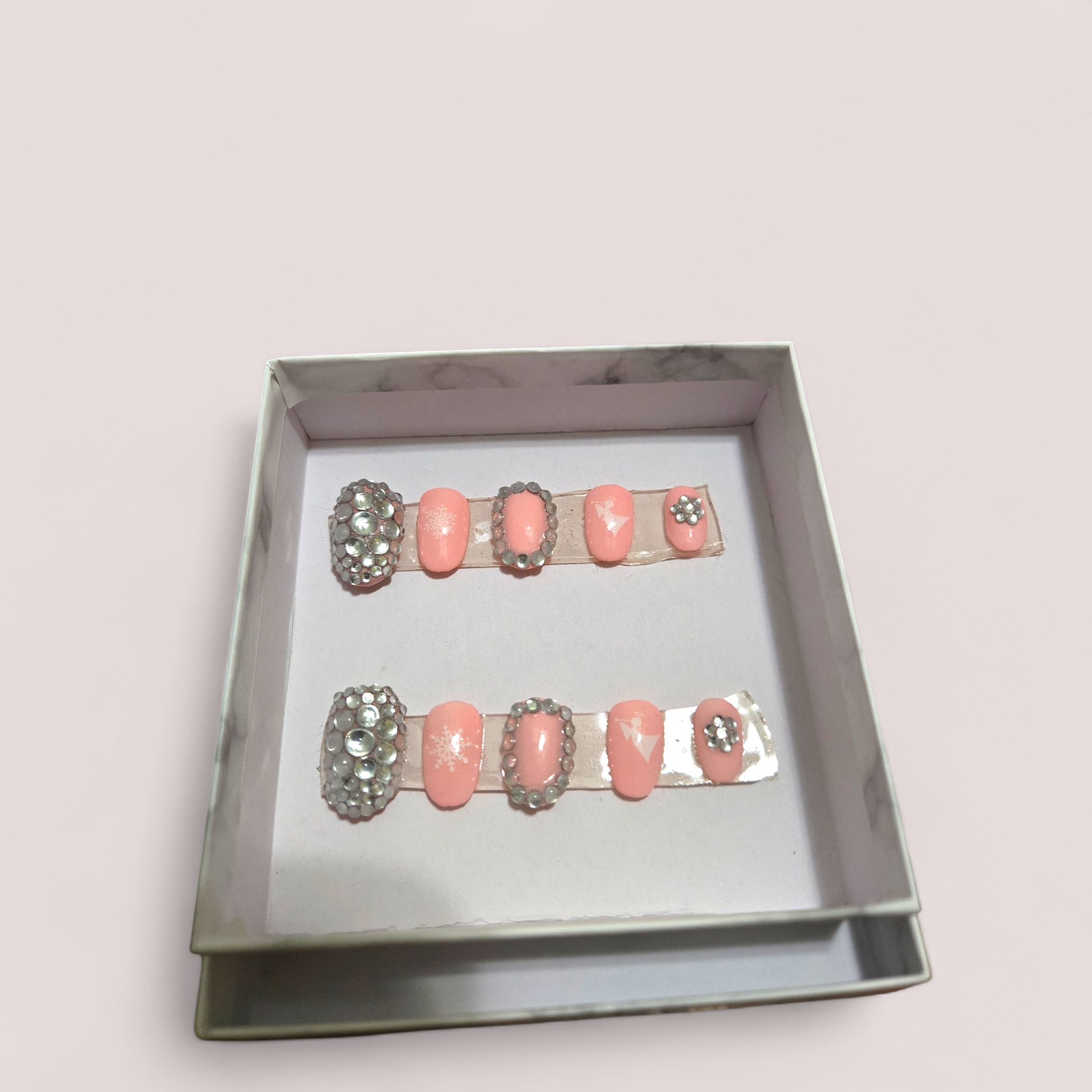 Short Round Nails, All nails are a light pink color, thumb has silver diamond decals, index has s white snowflake, middle finger has silver diamonds around edge, ring finger has angel playing flute, and pinky finger has a small circle of silver diamonds