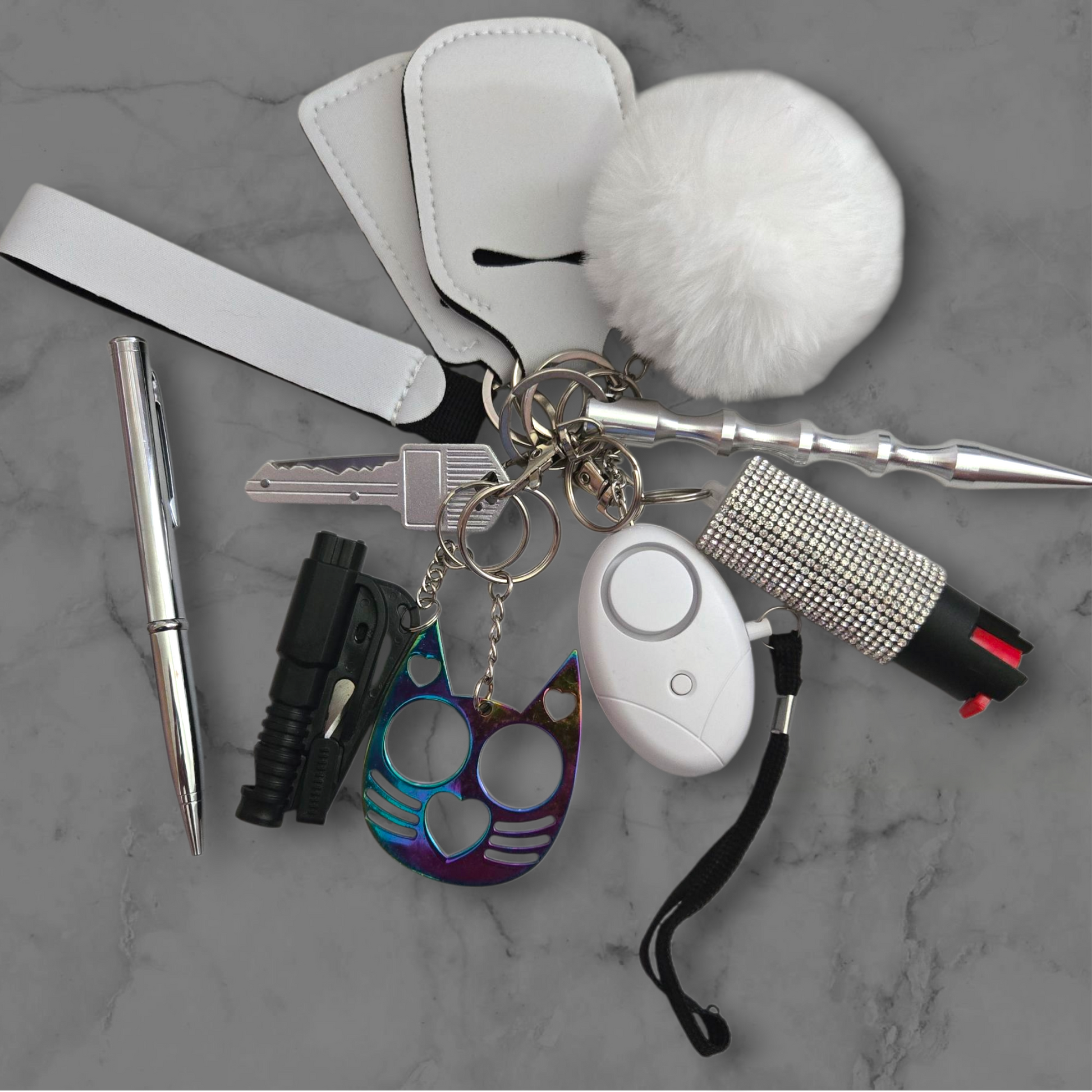 4pc set of wristlet, lip stick holder. Hand sanitizer holder with bottle, silver kubaton, pom pom, security Alarm, bling pepper spray, silver Pen Knife, Key Knife, Black Window Breaker, Iridescent Kitty Knuckles